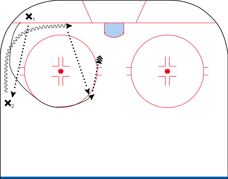 Players start below the goal line in the corner, and around the top of the circle, against the boards. The puck starts with the low player. The only constraint once the drill begins is the path of the players. The high player must skate around the bottom of the circle, and the low player must skate around the top of the circle. I’ve included two diagrams of some common options, but there are numerous possibilities, and I really encourage the players to get creative, as long as the pace stays high!